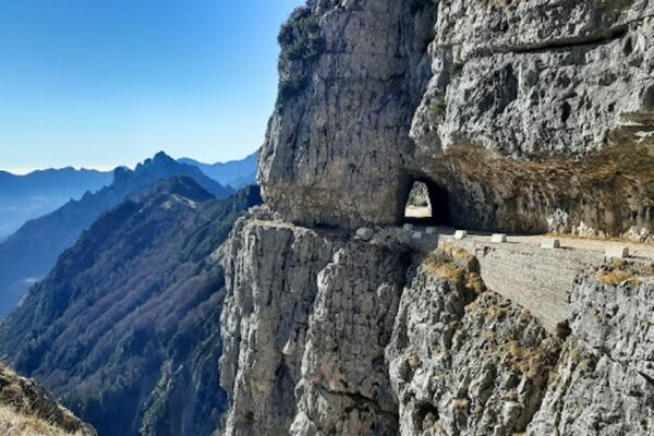 Questa strada ci porterà verso il rifugio Achille Papa, punto di arrivo della strada delle 52 gallerie del Pasubio. Un percorso molto panoramico, con strapiombi molto suggestivi e passaggi in gallerie, scavate durante la Prima guerra mondiale.