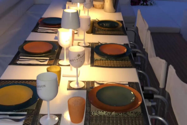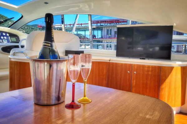 - All’arrivo a bordo, l’equipaggio accoglierà gli ospiti con frutta fresca di stagione, focaccia ligure e calici di Prosecco.